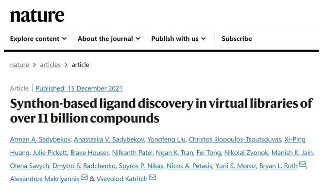 2021年12月15日,美國南加州大學、東北大學和北卡羅來納大學教堂山分校的研究團隊合作,在Nature發表了題為:Synthon-based ligand discovery in virtual libraries of over 11 billion compounds的研究論文。