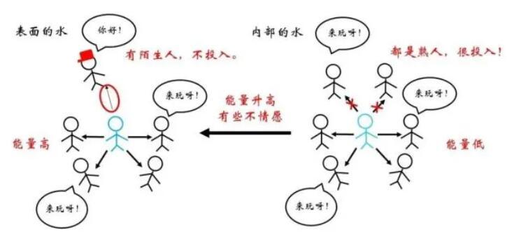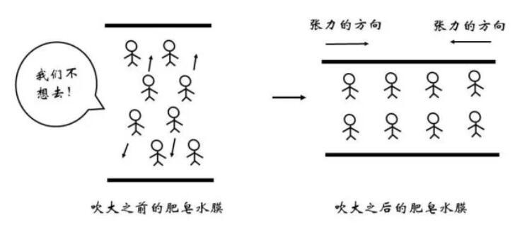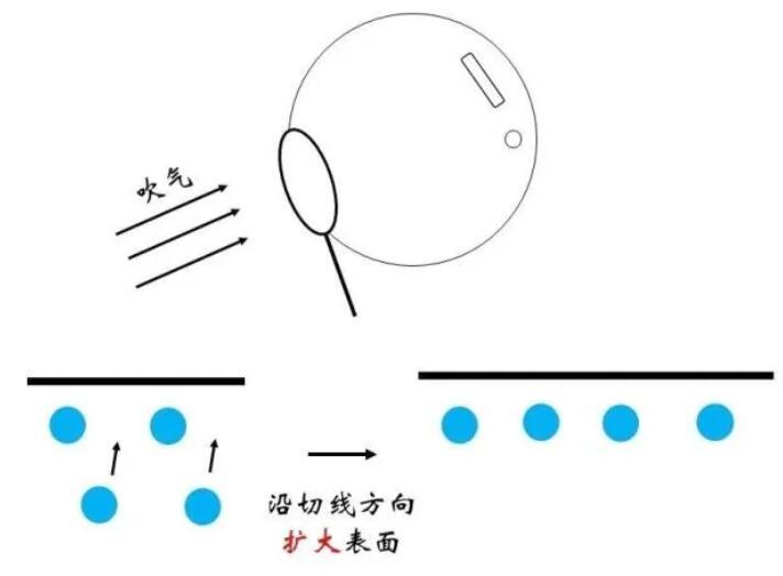 俗話說(shuō)“物以類聚,人以群分”,更加相似的同類分子間往往關(guān)系更為融洽,而不同種分子間的關(guān)系則相對(duì)疏遠(yuǎn)。在物理上表現(xiàn)為同類分子間的勢(shì)能曲線最低點(diǎn)更低。因此,對(duì)于一個(gè)存在于內(nèi)部的水分子,如果來(lái)到表面,需要斷開與同類分子的部分關(guān)系,而代之以與比較“生疏”的空氣分子間的作用,顯然是不情愿的!這體現(xiàn)為能量的升高。那么,什么情況下水分子要從內(nèi)部來(lái)到表面呢?正是吹泡泡的時(shí)候。