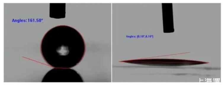 反之,對(duì)于疏水表面,固液界面處的表面張力可能非常大,以至于接觸角只有達(dá)到鈍角甚至趨近于180°才能達(dá)到平衡,此時(shí)的現(xiàn)象稱為非浸潤(rùn)或者不能浸潤(rùn)。而這種表面由于較高的疏水性被稱為超疏水表面。