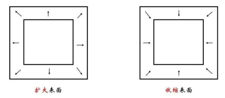 那么表面張力的方向是什么呢?我們同樣類比重力、彈力等力。簡(jiǎn)單回顧不難發(fā)現(xiàn),如果將表面張力理解為單位面積形變引起的能量升高,那么對(duì)應(yīng)的力應(yīng)該指向使得能量降低的方向。對(duì)于表面張力,自然就是沿切線使得表面收縮的方向。