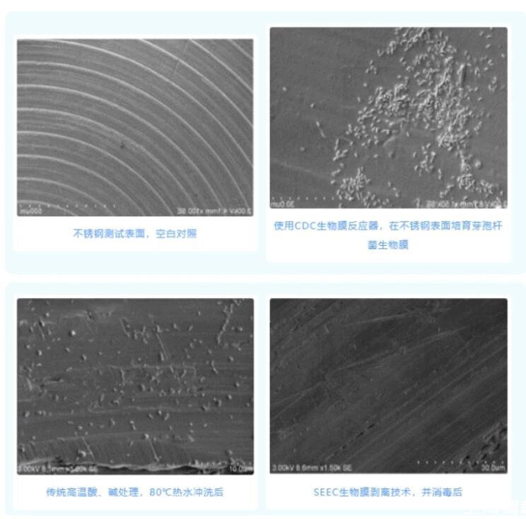 控制生物膜或微生物頻繁超標(biāo)的關(guān)鍵在于清除由胞外多聚物構(gòu)成的生物膜。當(dāng)系統(tǒng)中已出現(xiàn)生物膜時,應(yīng)首先清除對微生物起保護(hù)作用的生物膜,使微生物直接暴露于環(huán)境中,再對設(shè)備表面進(jìn)行消毒。生物膜可以為微生物提供對消毒劑的抗性,直接使用消毒劑效果不理想。且如果僅僅殺滅生物膜下微生物,而無法清除生物膜時,浮游微生物可不斷粘附于生物膜上,頻繁造成系統(tǒng)中微生物超標(biāo)等質(zhì)量問題。