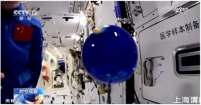 在泡騰片實驗中,王亞平向注入藍色顏料的水球中放入泡騰片,泡騰片入水后產生大量氣泡。