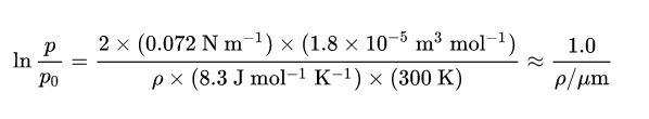 化學熱力學化學動力學方面就不說了,說一個不太一樣的。為什么潑在地上的水很快就干了,而洗完的衣服卻不容易晾干?并不是由于比表面積不同,衣服就只是一層布料,比表面積同樣很大。而是因為液滴的蒸氣壓與它表面的曲率半徑有關。這一關系由開爾文方程描述: