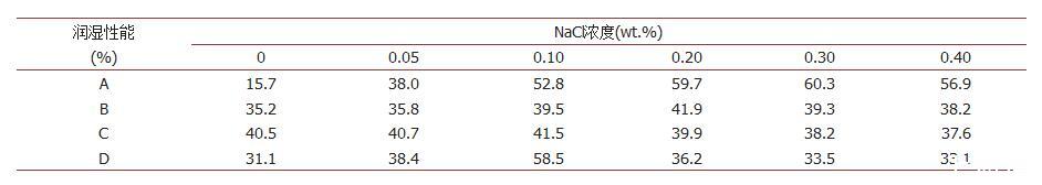 同樣根據(jù)滲透實(shí)驗(yàn)結(jié)果進(jìn)行潤(rùn)濕性能計(jì)算,具體見表3。由表3可以看到,抑塵劑A對(duì)NaCl最為敏感,隨著無機(jī)鹽含量的增加,抑塵劑在煤塵表面的潤(rùn)濕能力持續(xù)提高。當(dāng)加入0.3%NaCl時(shí),抑塵劑潤(rùn)濕相同煤塵高度所需要的時(shí)間降低至194 s,其潤(rùn)濕性能由15.7%提升至60.3%,在煤塵表面的潤(rùn)濕程度最高提升3.8倍左右;抑塵劑C對(duì)NaCl最不敏感,隨著NaCl濃度的增加,C溶液的潤(rùn)濕性能變化均比較小,潤(rùn)濕性提高程度不超過1%。對(duì)于四種抑塵劑A,B,C和D,它們對(duì)應(yīng)最佳提高潤(rùn)濕性能的NaCl濃度分別為0.3%、0.2%、0.1%和0.1%。