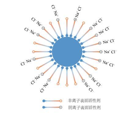 抑塵劑主要由陰離子表面活性劑、非離子表面活性劑以及其他助劑組成。其中,表面活性劑是一種具有兩親性的物質(zhì),加入少量能使其溶液體系的界面狀態(tài)發(fā)生明顯變化,是抑塵劑的重要組成部分。如圖4所示,煤塵表面暴露著大量的極性有機(jī)基團(tuán),水在煤塵表面很難發(fā)生潤(rùn)濕行為;抑塵劑中的表面活性劑親油端與煤塵表面的有機(jī)基團(tuán)具有較好的相容性,能夠在煤塵表面定向排列并且將親水基團(tuán)引入煤塵表面,增加了水與煤塵之間的潤(rùn)濕能力。無機(jī)鹽的引入對(duì)于陰離子表面活性劑具有增效作用。根據(jù)雙電層理論,雙電層可以分為緊密層和擴(kuò)散層,當(dāng)溶液中加入無機(jī)鹽后,無機(jī)鹽中的離子會(huì)壓縮擴(kuò)散層,使得擴(kuò)散層厚度減小,從而降低了界面能;同時(shí)其無機(jī)鹽離子還能減小雙電層中的靜電力作用,促進(jìn)了抑塵劑在煤塵表面的吸附,提高了潤(rùn)濕性能。