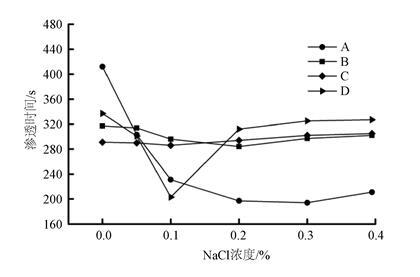 從圖4可知,NaCl對(duì)于提高抑塵劑潤(rùn)濕性能的作用更為顯著。因此,在抑塵劑中加入不同濃度的NaCl,研究無機(jī)鹽濃度對(duì)煤塵NR的潤(rùn)濕性能的影響。如圖5所示,少量的NaCl的引入,能夠降低抑塵劑在煤塵表面的滲透時(shí)間。NaCl的引入能夠降低抑塵劑溶液的表面張力,使抑塵劑在煤塵表面的接觸角不斷降低[18]。另外,無機(jī)鹽能夠增強(qiáng)表面活性物質(zhì)在煤塵表面的吸附能力,降低煤塵與抑塵劑之間的界面能,提高了抑塵劑對(duì)煤塵的潤(rùn)濕性能;煤塵中含有大量的酚羥基、羧基等有機(jī)基團(tuán),因此煤塵表面呈現(xiàn)電負(fù)性[19]。當(dāng)NaCl含量持續(xù)增加時(shí),抑塵劑A、B、C在煤塵表面的滲透時(shí)間趨于平穩(wěn),而抑塵劑D出現(xiàn)滲透時(shí)間增加后平緩的趨勢(shì)。相比之下,抑塵劑B、C對(duì)于NaCl的敏感程度較低,隨著NaCl含量增加其潤(rùn)濕能力變化不大;NaCl對(duì)抑塵劑A、D在煤塵表面的潤(rùn)濕能力影響程度較大。
