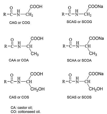 酰基氨基酸表面活性劑,即相應(yīng)的CAG、COG、CAA、COA、CAS和COS的鈉鹽,通過用NaOH水溶液中和酰基氨基酸至pH 8-9直至獲得完全澄清的溶液來制備。這些鈉鹽分別命名為SCAG、SCOG、SCAA、SCOA、SCAS和SCOS。
