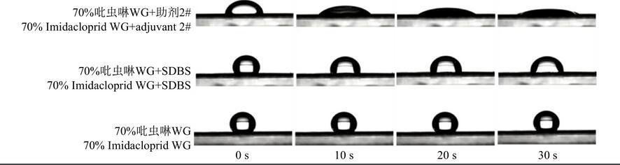 試驗過程中發現,添加各供試助劑后的藥液液滴在小麥葉片正、反面上的展布行為基本相似,但展布的速率和面積不同,因此以加入助劑2#和SDBS的吡蟲啉藥液在水平放置的小麥葉片上的鋪展情況(圖4、5)為例,說明添加不同助劑后藥液在小麥葉片上的鋪展行為。藥液液滴以零速度放置于小麥葉片上,長軸方向平行于葉脈,展布速度較快,短軸方向垂直于葉脈,展布速度較慢,且鋪展面積在20 s左右趨于穩定。由圖4、5可知:添加了助劑2#的藥液因其表面張力下降至21.98 mN/m,小于小麥葉片正反面的表面張力,可以在小麥葉片潤濕展布,隨時間變化接觸角減小,展布程度增大;而添加了SDBS助劑和未添加助劑的藥液表面張力大于小麥葉片的表面張力,在小麥葉片上不鋪展或鋪展速度較慢。在農藥使用過程中,藥液在小麥葉面上的展布性越好,鋪展的面積就越大,相應的防治面積也就越大,藥液黏附于作物葉面上的可能性就越大,從而減少了農藥流失進入環境的概率,大大地提高農藥利用率和施藥效果。