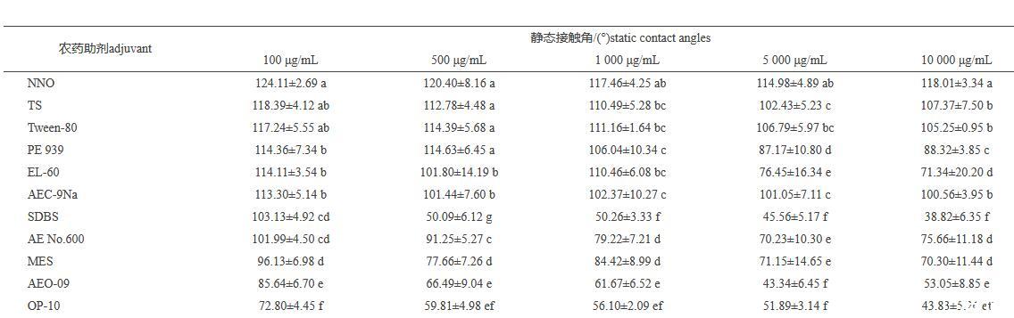 表3不同質量濃度的助劑溶液在小麥葉正面上的靜態接觸角(mean±SD,n=5)