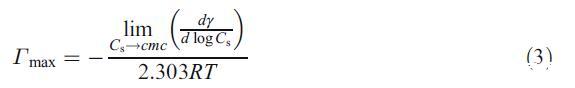 NP 溶液在不同 hp-β-CD 濃度下的界面張力(γ)如圖 1 所示。在任何 hp-β-CD 濃度下,界面張力隨著 NP 的增加而降低。 Hp-β-CD 由七個葡萄糖單元組成,形成一個具有親水外表面和疏水內(nèi)腔的環(huán),眾所周知,它主要以 1:1 的化學計量將客體分子結(jié)合到疏水腔中 [11]。 在 hp-β-CD 的水溶液中,NP 被認為結(jié)合了 hp-β-CD 的疏水腔。 眾所周知,Hp-β-CD 由于其親水性外表面而不吸附在空氣-溶液界面。 這表明未摻入 hp-β-CD 腔的 NP 分子吸附在空氣 - 溶液界面。 在任何 hp-β-CD 濃度下均未觀察到表明膠束化開始的斷點(即臨界膠束濃度 (cmc))。 由于 NP 非常疏水,體相中的 NP 單體濃度不能增加到 cmc。 根據(jù) γ 與 log CS,非離子 NP 的最大表面過量 (Γmax) 通過 Gibb 吸附方程估計如下 [12]: