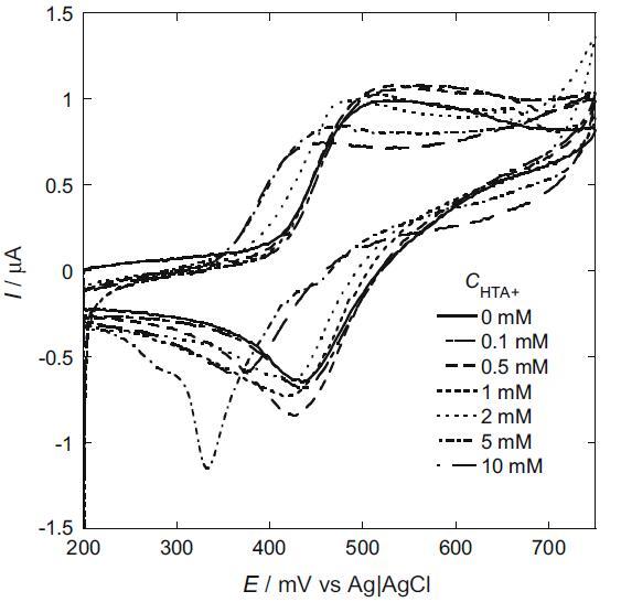 我們還研究了 HTA+ 陽離子的影響(圖 6)。 來自界面張力測量的 HTA+ 離子的 cmc 與圖 6 標題中所述的 CV 測量溶液相同,為 3.95 mM。 I2/I? 的陽極和陰極峰均高于不存在 HTA+ 時的峰。 陽極和陰極峰值電流的增加是由于被捕獲的 I? 和 I2 從 hp-β-CD 釋放到主體中,這是由 hp-β-CD 腔中的 I? 和 I2 置換引起的與 HTA+。 另一方面,隨著 HTA+ 的濃度增加到 cmc 以上,陽極和陰極峰值電流都變得低于預膠束濃度下的峰值電流。 在 I2 和 I- 鍵合到膠束經(jīng)歷電子轉(zhuǎn)移之前,膠束必須轉(zhuǎn)向,使 I2 和 I- 面向電極表面。 它導致峰值電流的降低。 此外,陽極和陰極峰值電位都向負方向移動。 這表明溶解在 HTA+ 膠束中的 I2 比鍵合到 HTA+ 膠束表面的 I- 更穩(wěn)定。 隨著 HTA+ 濃度增加到 5 mM,在 330 mV 處觀察到一個尖銳的吸附減少峰。 已知在不存在任何表面活性劑的情況下,在鉑電極表面形成的 I2 會吸附在電極表面 [19]。 在我們的系統(tǒng)中,HTA+ 在低 HTA+ 濃度下抑制了 I2 的吸附。 然而,隨著HTA+濃度的增加,形成了HTA+單層,導致電極表面HTA+單層中的I2被吸收。 隨著 HTA+ 濃度增加至 10 mM,吸附還原峰消失。 在這個濃度下,在電極表面形成的 I2 溶解到 HTA+ 膠束中。 因此,沒有觀察到吸附峰。