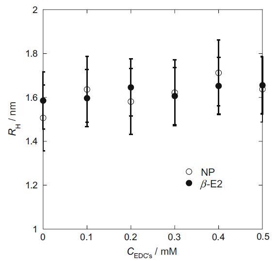 我們在每個 EDC 存在下通過動態(tài)光散射方法研究了 HTA+ 膠束的 RH(圖 4)[17]。 隨著 EDCs 濃度的增加,膠束的流體動力學半徑似乎逐漸增加。