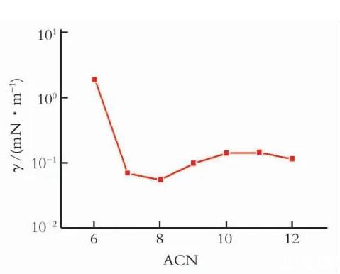 圖2 0.1%C16ESB與不同鏈長正構(gòu)烷烴間界面張力穩(wěn)態(tài)值
