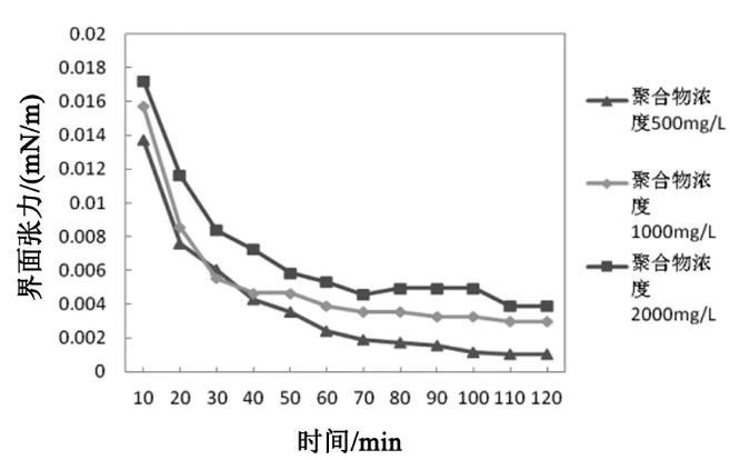 在石油磺酸鹽濃度為0.1%,模擬污水礦化度4200 mg/L,碳酸鈉濃度0.6%條件下,分別測定聚丙烯酰胺濃度為500、1000和2000 mg/L的復合體系隨時間變化的界面張力值,結果如圖2所示。