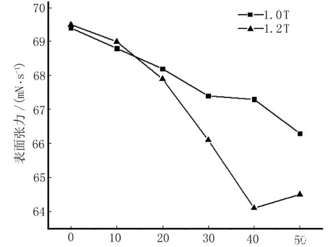 對比圖3中的2條線可知,當磁場強度為1.2 T時,磁化水表面張力的幅值下降幅度范圍為1.0~5.0 mN·m-1。由此可知,磁化水表面張力變化的幅度取決于磁場的強度。一定程度上,磁場強度越大,磁化水表面張力變化的幅值越大,并且不同的磁場強度,表面張力的變化速度有所差異。