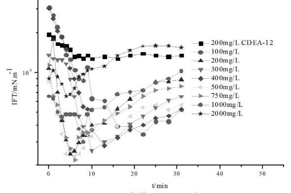 圖2濃度為200mg/LCDEA-12分別與不同濃度NNR復配油水動態界面張力關系