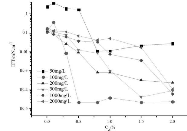 通過測定不同碳數烷基醇酰胺非離子表面活性劑及機NNR的界面張力,CDEA-14及NNR的界面張力最低,將CDEA-12與CDEA-14、NNR、碳酸鈉、復配均能降低CDEA-12的界面張力,甚至能降到10-4-10-5mN/m超低界面張力。復配體系有待進一步研究,實現更好的乳化性能及超低界面張力。