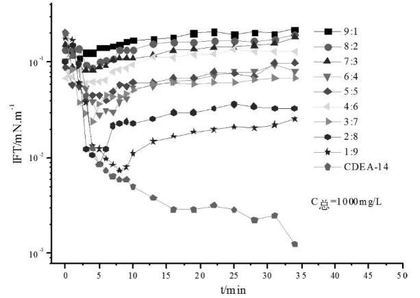 在總濃度為500-1000mg/L范圍內,CDEA-12與CDEA-14按比例9:1,8:2,7:3,6:4,5:5,4:6,3:7,2:8,1:9比例復配[4-5],測定油水界面張力。