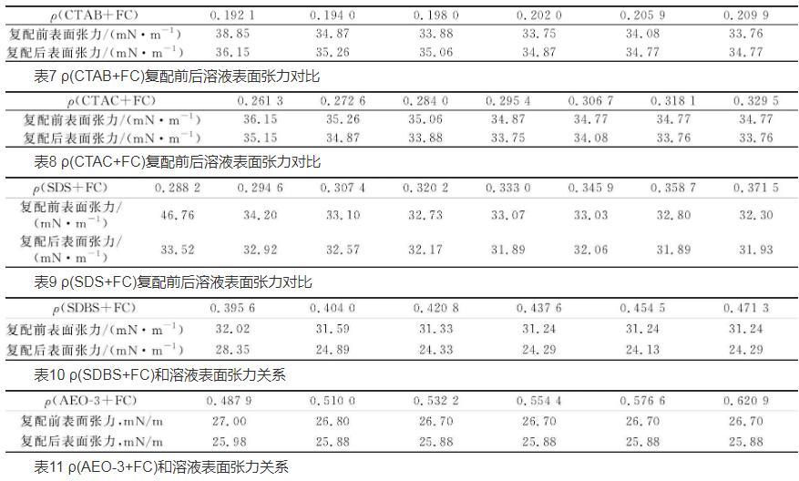 為了更好地提高表面活性劑的性能,降低表面活性劑的應用成本,減輕其對環境的危害。在室溫下,分別測試不同濃度的碳氫表面活性劑與FC復配后表面張力的變化,實驗結果見表7~11。